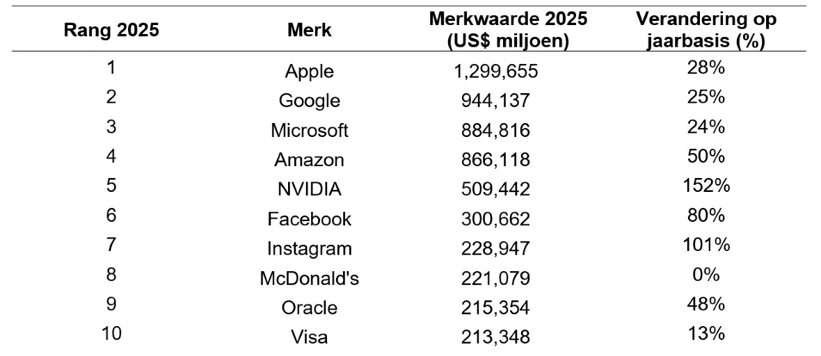 De lijst kent ook andere opvallende nieuwkomers en stijgers, zoals ChatGPT (plek 60), Stripe (85), Chipotle (86) en het Indiase Airtel, het snelst groeiende telecommerk wereldwijd. Apple blijft voor het vierde jaar op rij de nummer één met een merkwaarde van 1,3 biljoen dollar, gevolgd door Google en Microsoft.
