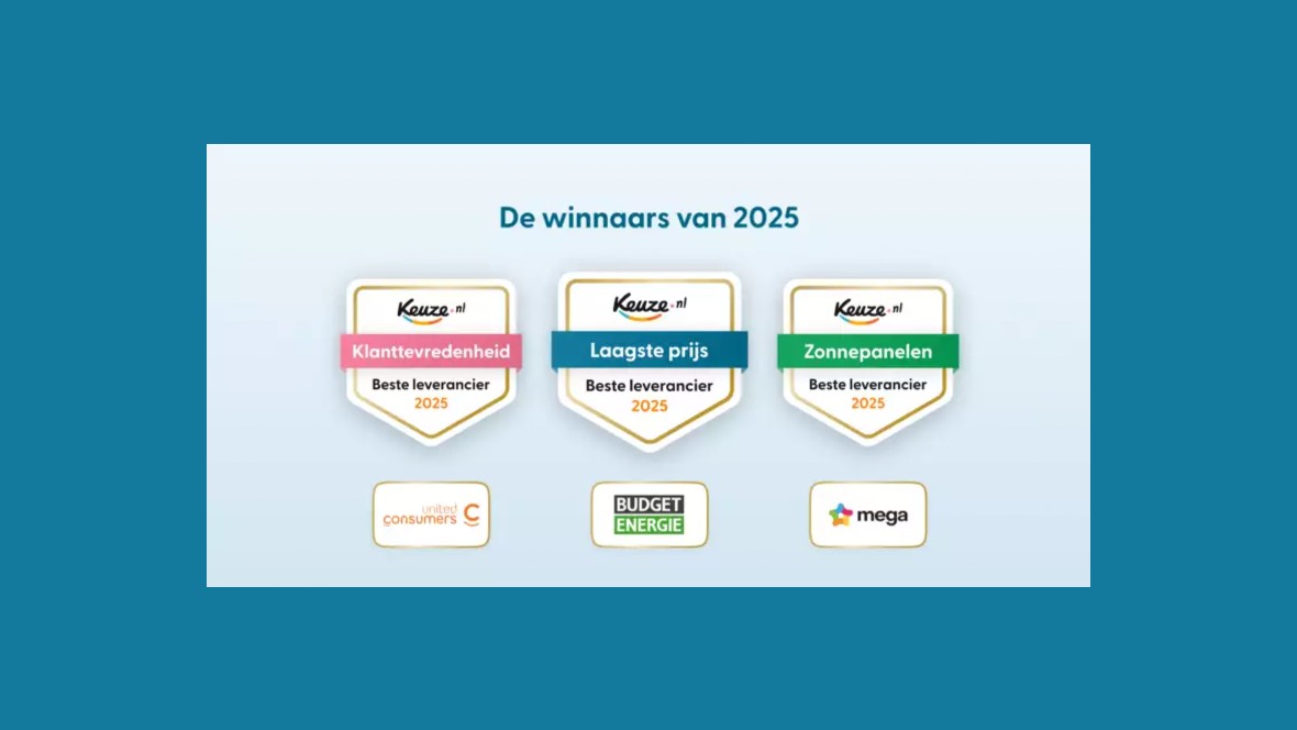 Keuze.nl heeft de beste energieleveranciers van 2025 bekendgemaakt. Budget Energie, Mega en UnitedConsumers vallen op in de categorieën prijs, zonnepanelen en klanttevredenheid.