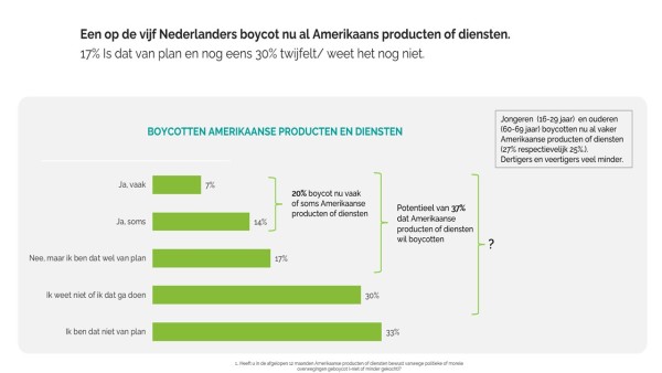 Eén op de vijf Nederlanders boycot actief Amerikaanse merken om politieke redenen. Nog eens 17% overweegt dat te gaan doen. Dit blijkt uit onderzoek van Improof Research in opdracht van Value@Stake.