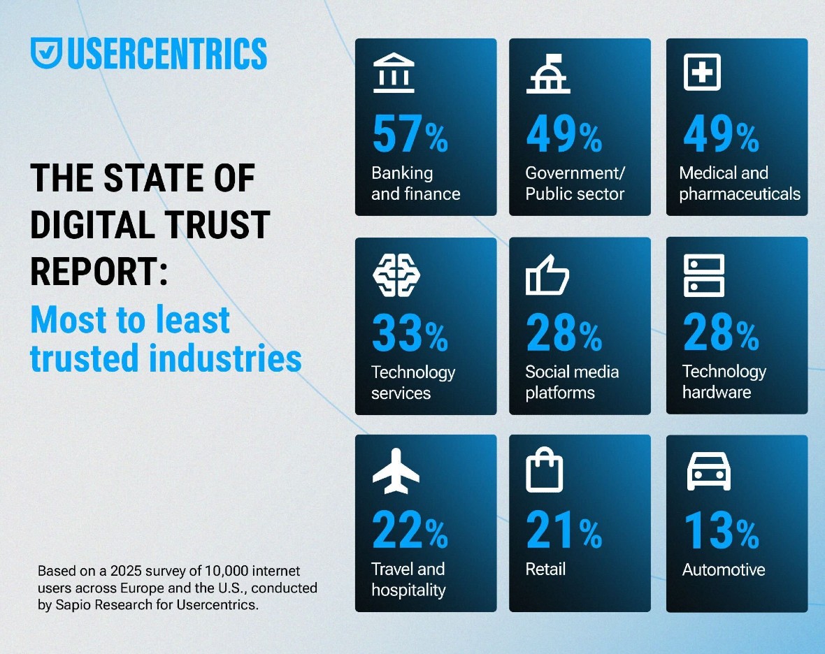 Het rapport laat verder zien dat sectoren als banken (58%) en publieke instellingen (66%) nog relatief goed scoren qua vertrouwen. Sociale media (20%), horeca (21%) en de auto-industrie (21%) blijven daarentegen ver achter.