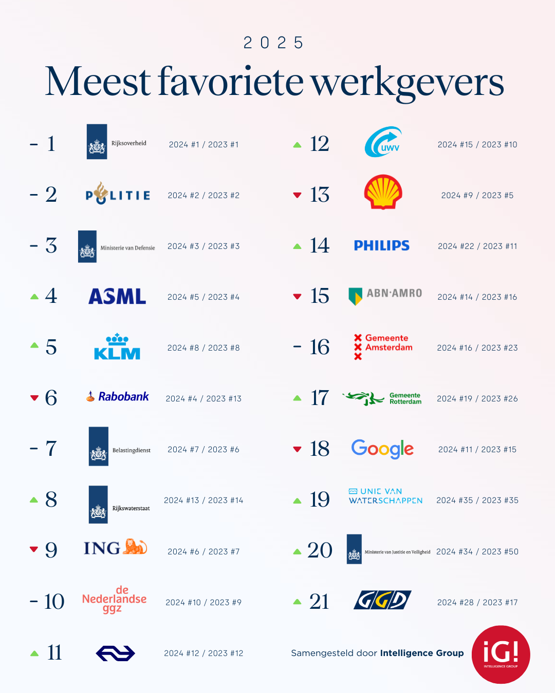 In 2025 geven Nederlandse werkenden vaker de voorkeur aan publieke organisaties. Dat blijkt uit de jaarlijkse lijst ‘Meest favoriete werkgevers’ van onderzoeksbureau Intelligence Group. Overheidsinstellingen stijgen massaal op de ranglijst, terwijl commerciële bedrijven terrein verliezen. Alleen ASML, KLM en Philips breken met die trend.