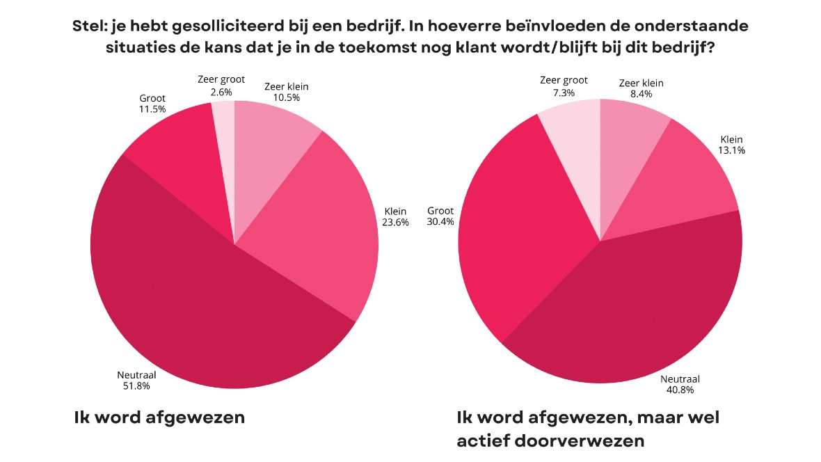 In het onderzoek werd respondenten gevraagd in hoeverre een afwijzing invloed heeft op hun toekomstige klantrelatie met een organisatie. Wanneer kandidaten worden afgewezen zonder verdere actie, geeft 34,1% aan geen klant meer te willen worden of blijven. Worden zij na afwijzing actief doorverwezen naar bijvoorbeeld een andere werkgever, dan daalt dit percentage naar 21,5%. Dat betekent een daling van bijna 37% in het aantal kandidaten dat afhaakt als (potentiële) klant, puur door een eenvoudige opvolgactie.