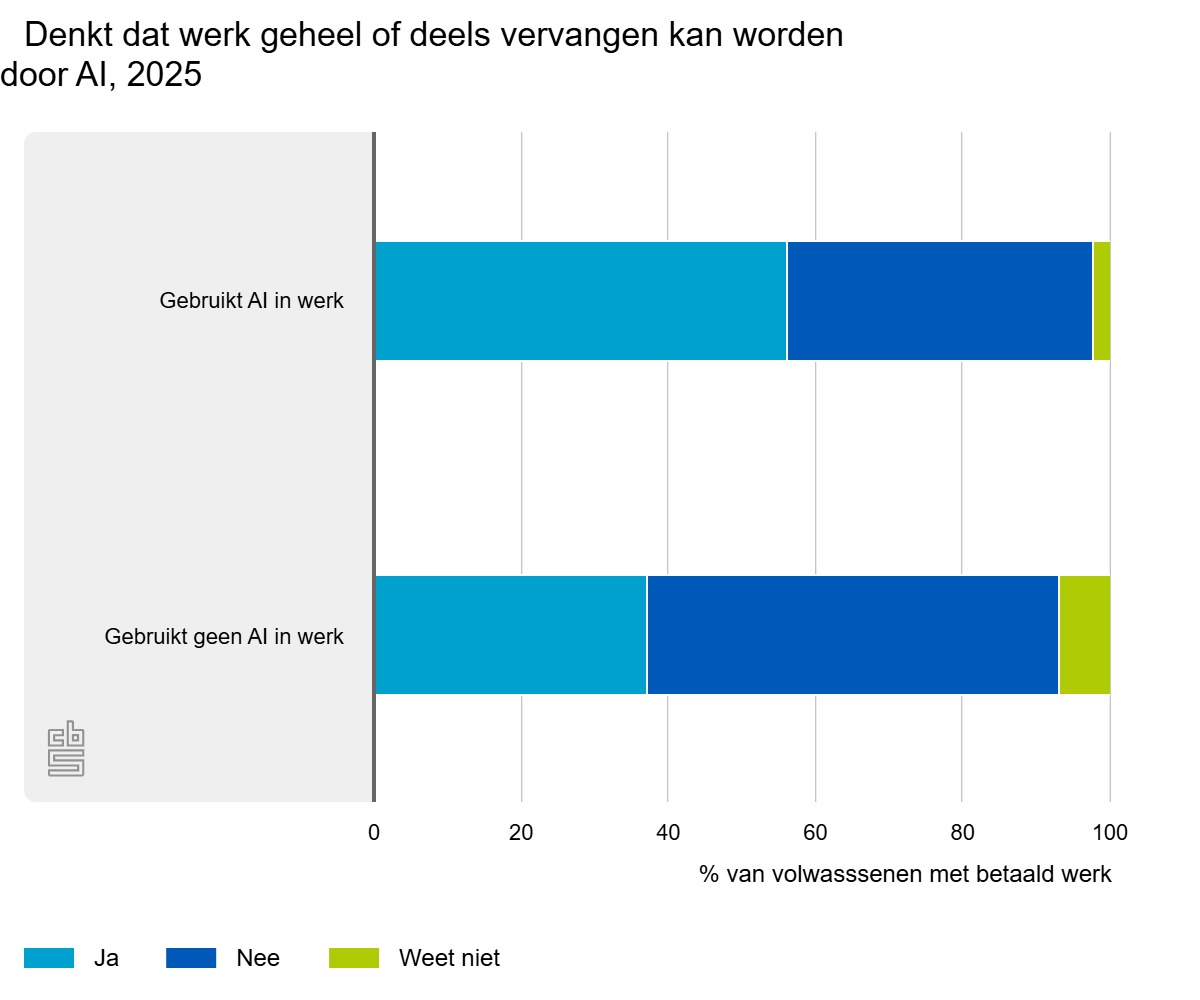 Volgens het CBS gebruikt 43% van de volwassenen met betaald werk AI bij de uitvoering van werkzaamheden. Werkenden die AI toepassen, denken vaker dat hun werk geheel of deels vervangen kan worden door AI (56%) dan werkenden die geen AI gebruiken (37%). Andersom geldt dat mensen die nog niet met AI werken, vaker verwachten dat hun werk niet kan worden overgenomen door AI. Hbo- en wo-geschoolden en jongvolwassenen geven vaker dan gemiddeld aan dat AI hun werk deels of volledig kan uitvoeren.