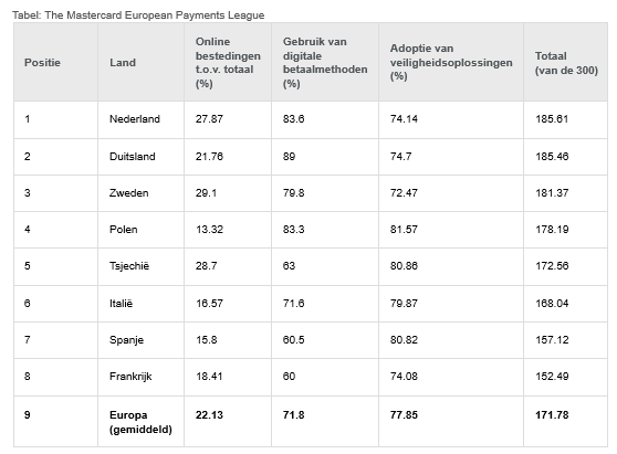Nederland is uitgeroepen tot digitaal betalingskampioen van Europa in de eerste European Payments League van Mastercard. De ranglijst vergelijkt negen grote Europese markten op het gemak en de veiligheid van online betalen en de mate waarin consumenten overstappen op volledig digitale afrekenprocessen zonder handmatige kaartinvoer. Nederland eindigt bovenaan, gevolgd door Duitsland en Zweden.