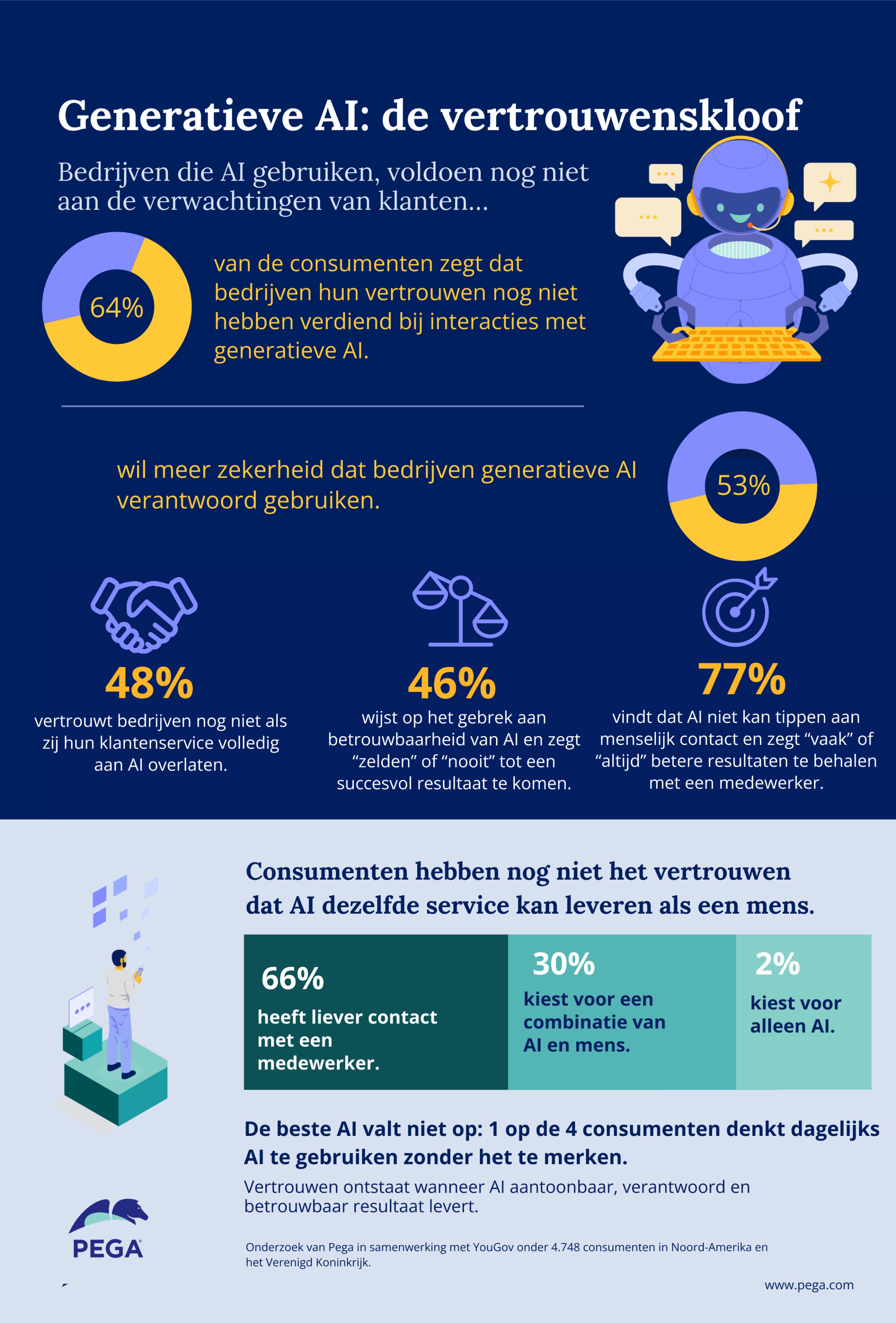 Bijna tweederde (64%) van de respondenten heeft weinig tot geen vertrouwen in de manier waarop bedrijven generatieve AI inzetten in klantcontact. Meer dan de helft (53%) twijfelt of organisaties dit op een verantwoorde manier doen. Volgens de onderzoekers worden AI-gedreven interacties vaak ervaren als onnauwkeurig en onvoorspelbaar.
